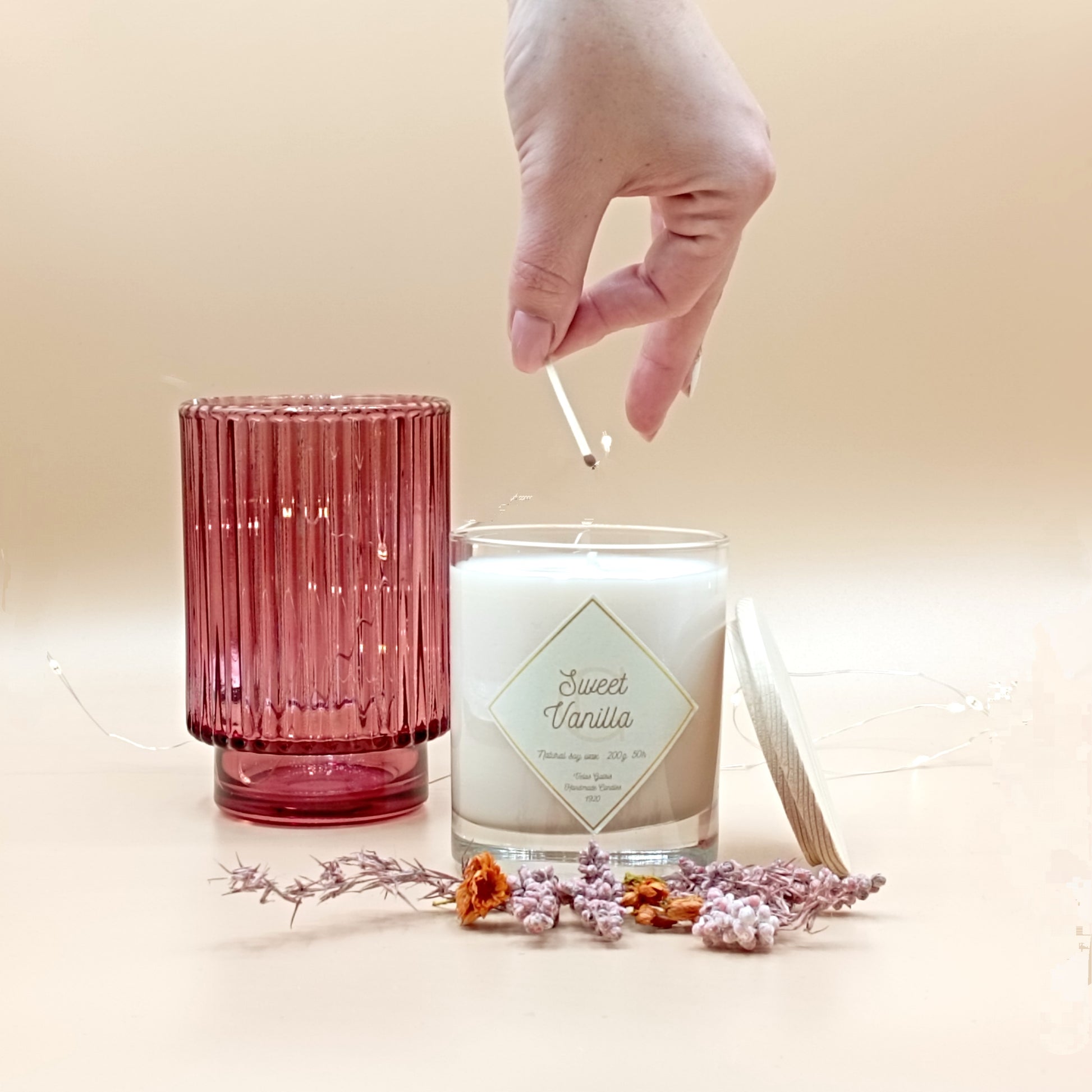 Velas perfumadas de cera de soja 100% natural y mecha de algodón, vertidas a mano sin parafinas ni aceite de palma. Vaso de vidrio reciclado y tapa de madera de pino, con estuche individual.